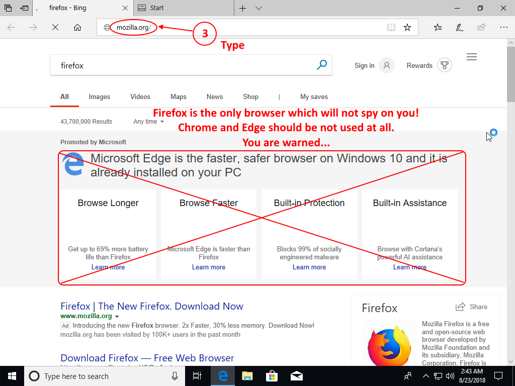 Edit this page Discussion Backlinks Fold/unfold all Rename Page Why FireFox - you may ask? Well, there are a lot of reasons for that, but most important one is that FireFox really does care about your online privacy. I have no desire to feed MS and Google's Big Data servers with my sensitive information. At last we are talking about protecting our cryptomining farm from “probably yet unknown” security threats, in such a case we should take every possible measure to prevent a malicious actor from stealing our hard mined coins. Once again, it's up to you, I can't insist. But my choice is FireFox. Installing via full (off-line) installer This is a recommended way of installing FireFox on freshly installed Windows computer. Download Firefox before installing Windows and put it onto the same bootable USB media. If you are installing Windows don't enable internet connection until you've completed Block Windows Update step. So, I'll repeat it once again - please, download FireFox before installing Windows. Credits ghacks.net. Open the download page https://www.mozilla.org/en-US/firefox/all/ in your browser. Search for the language of your choice or just scroll down the page to locate it. Click a download link in the Windows 64-bit column. Wait for download to complete and copy the downloaded file to your USB drive. You'll be able to run the installer later for your freshly installed Windows machine even without a network connection. attachment Installing via stub (on-line) installer Click the blue IE icon on taskbar. Click the Close button to close the setup page. attachment 3. Type mozilla.org in the address bar. attachment 4. Click the Download FireFox button. Layout of mozilla.org site may looks different. attachment attachment 5. Click the Run button. attachment 6. Just wait for the installer to finish its work. In newer versions of FireFox layout of its UI may looks different. attachment 7. Close the tab. Don't give your email even to Mozilla.org attachment 8. Start FireFox by clicking the icon on the taskbar. 9. Click the Use Firefox as my default browser button. attachment 10. Click the Microsoft Edge icon. 11. Click the Firefox icon in popup menu. attachment Funny MS… 12. Click the Switch anyway text. 13. Close the dialog window. attachment Let's configure Firefox for providing even more privacy and security. 14. Click the Menu icon at the top right corner of Firefox. 15. In the pull-down menu click the Options item. Firefox will open the Options page. 16. Click the Privacy & Security item 17. Adjust settings according to the screenshot. attachment Log In Detach Close This topic does not exist yet You've followed a link to a topic that doesn't exist yet. If permissions allow, you may create it by clicking on “Create this page”.